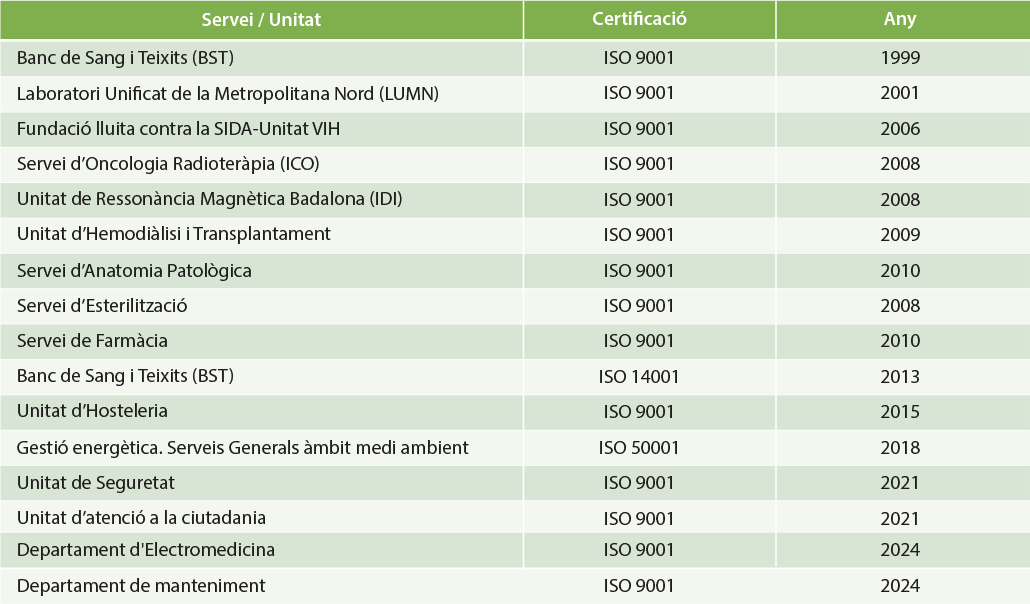 ISO 9001 certification means the implementation of a quality management system in a specific area within an organization. Traditionally, the first areas to be certified have been the central services of hospitals, although at Germans Trias we also have clinical areas certified or in the process of ISO 9001 certification. In all these areas, there is a commitment to continuous improvement .